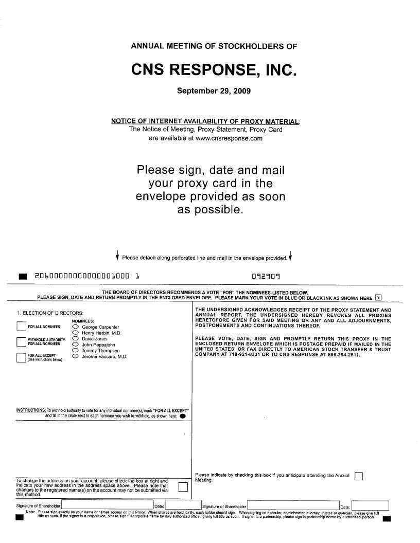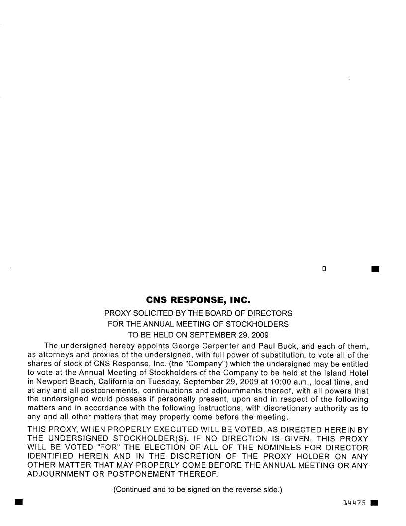 vote all of the shares of stock of CNS Response, Inc. (the “Company”) which the
