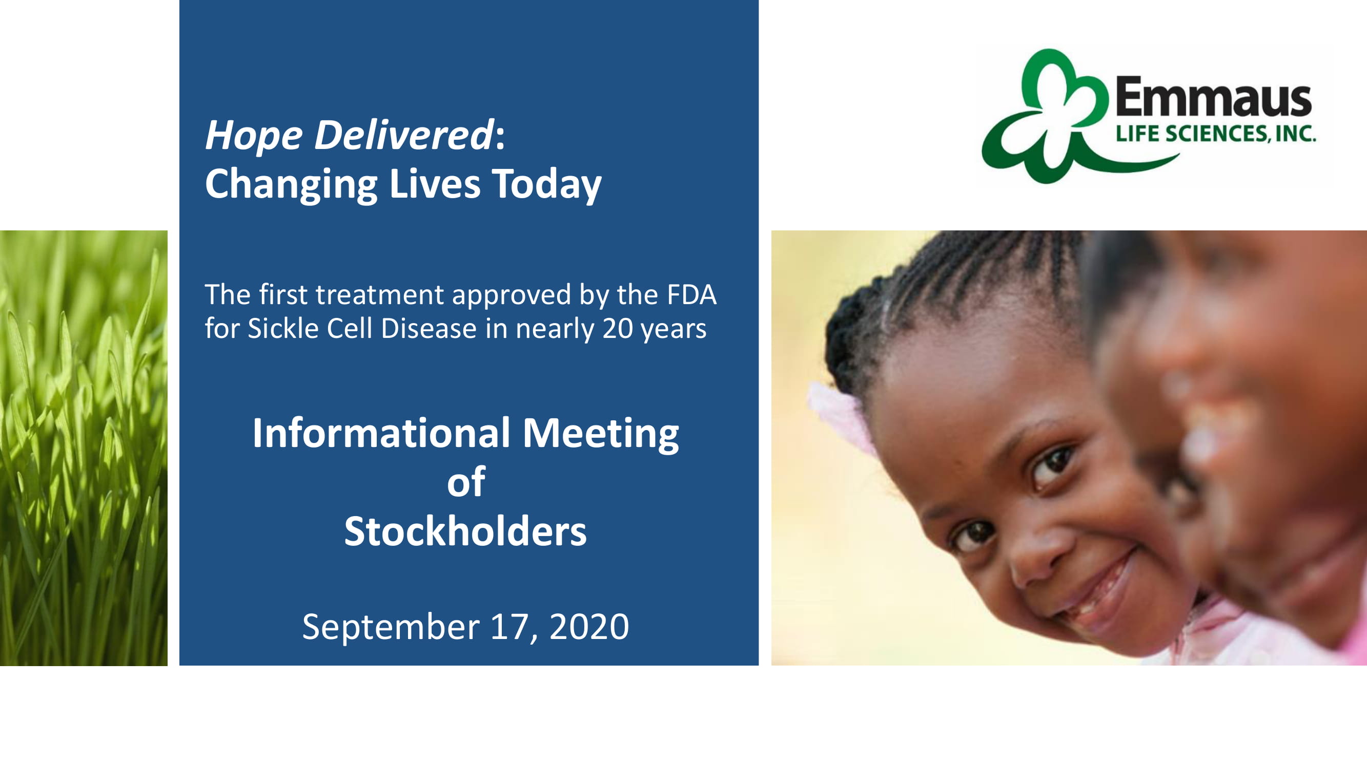 Hope Delivered : Changing Lives Today The first treatment approved by the FDA for Sickle Cell Disease in nearly 20 years Informational Meeting of Stockholders September 17, 2020