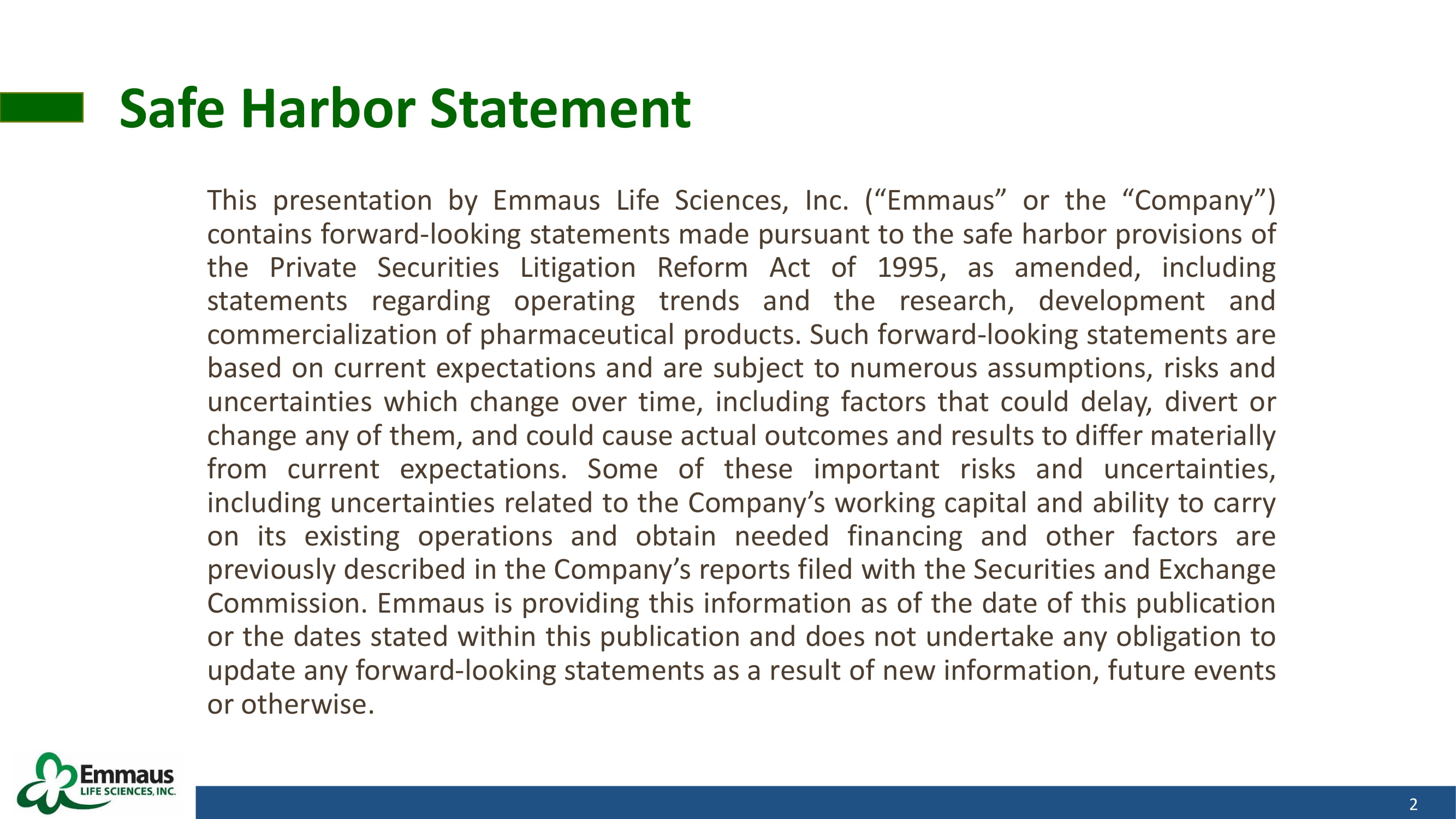 Safe Harbor Statement This presentation by Emmaus Life Sciences, Inc . (“Emmaus” or the “Company”) contains forward - looking statements made pursuant to the safe harbor provisions of the Private Securities Litigation Reform Act of 1995 , as amended, including statements regarding operating trends and the research, development and commercialization of pharmaceutical products . Such forward - looking statements are based on current expectations and are subject to numerous assumptions, risks and uncertainties which change over time, including factors that could delay, divert or change any of them, and could cause actual outcomes and results to differ materially from current expectations . Some of these important risks and uncertainties, including uncertainties related to the Company’s working capital and ability to carry on its existing operations and obtain needed financing and other factors are previously described in the Company’s reports filed with the Securities and Exchange Commission . Emmaus is providing this information as of the date of this publication or the dates stated within this publication and does not undertake any obligation to update any forward - looking statements as a result of new information, future events or otherwise . 2
