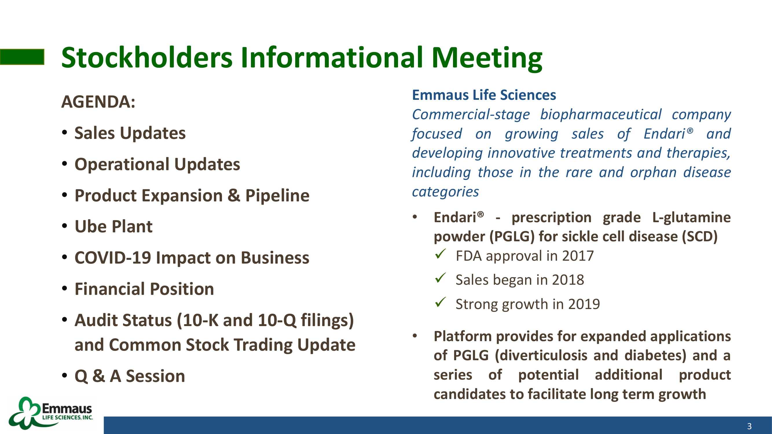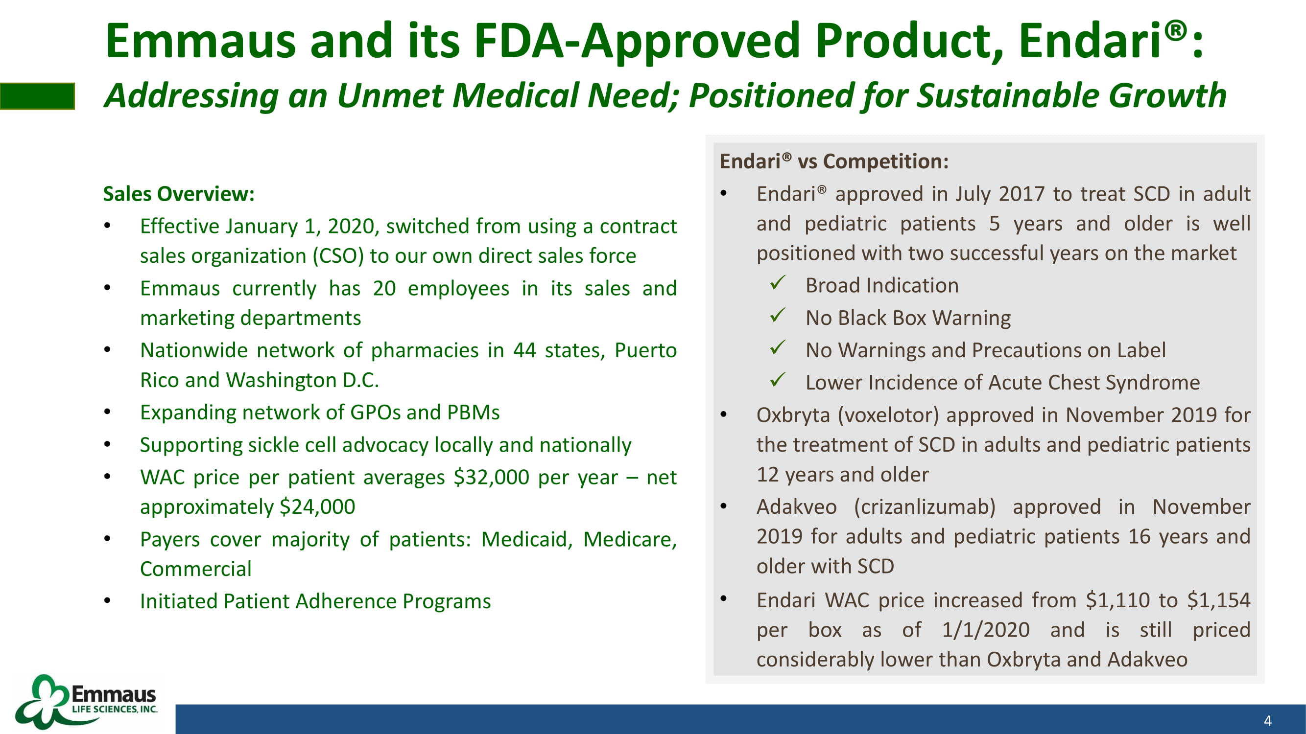 Stockholders Informational Meeting AGENDA: • Sales Updates • Operational Updates • Product Expansion & Pipeline • Ube Plant • COVID - 19 Impact on Business • Financial Position • Audit Status (10 - K and 10 - Q filings) and Common Stock Trading Update • Q & A Session 3 Emmaus Life Sciences Commercial - stage biopharmaceutical company focused on growing sales of Endari® and developing innovative treatments and therapies, including those in the rare and orphan disease categories • Endari® - prescription grade L - glutamine powder (PGLG) for sickle cell disease (SCD) x FDA approval in 2017 x Sales began in 2018 x Strong growth in 2019 • Platform provides for expanded applications of PGLG (diverticulosis and diabetes) and a series of potential additional product candidates to facilitate long term growth