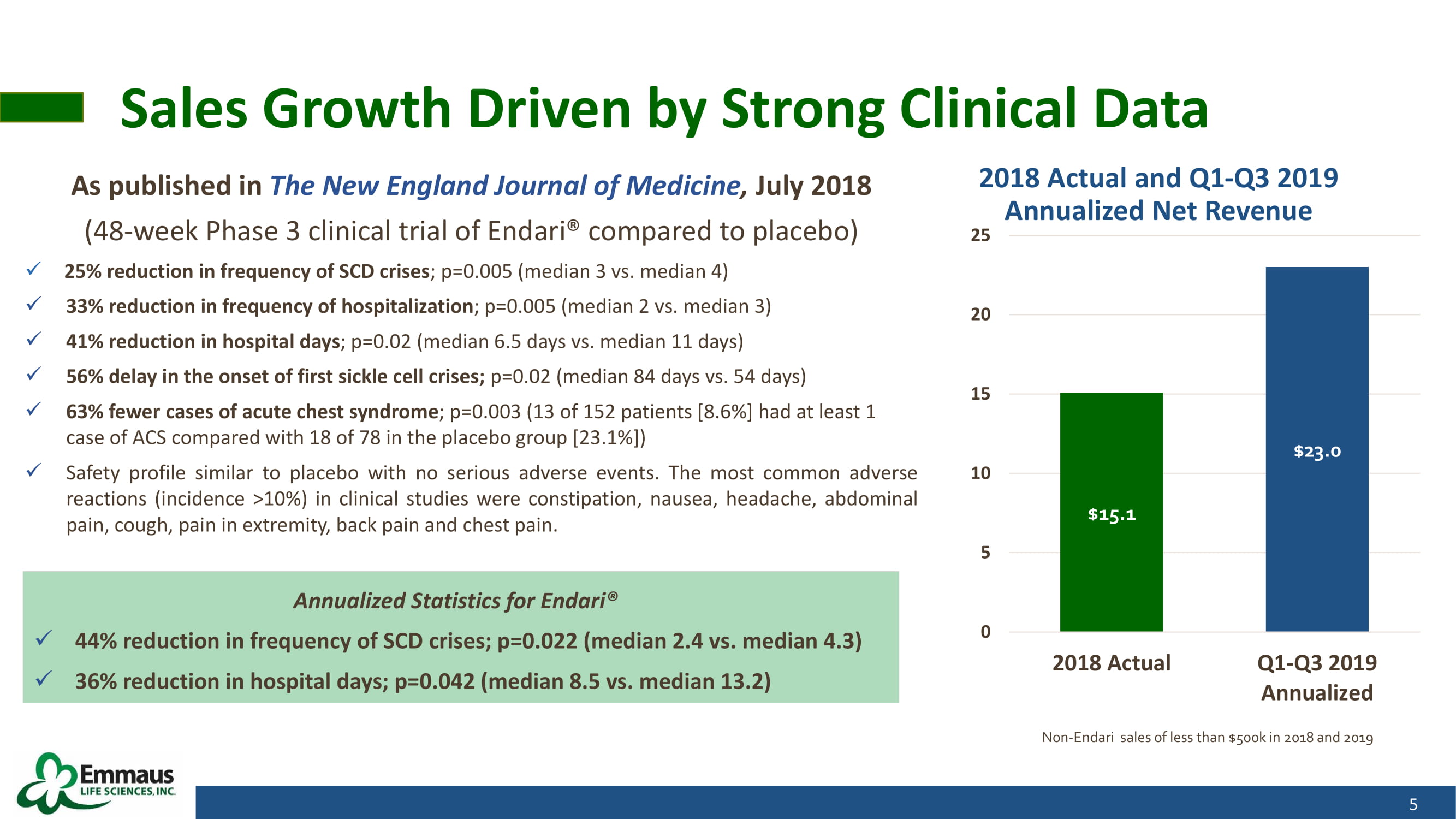 Emmaus and its FDA - Approved Product, Endari®: Addressing an Unmet Medical Need; Positioned for Sustainable Growth 4 Sales Overview : • Effective January 1 , 2020 , switched from using a contract sales organization (CSO) to our own direct sales force • Emmaus currently has 20 employees in its sales and marketing departments • Nationwide network of pharmacies in 44 states, Puerto Rico and Washington D . C . • Expanding network of GPOs and PBMs • Supporting sickle cell advocacy locally and nationally • WAC price per patient averages $ 32 , 000 per year – net approximately $ 24 , 000 • Payers cover majority of patients : Medicaid, Medicare, Commercial • Initiated Patient Adherence Programs Endari® vs Competition: • Endari® approved in July 2017 to treat SCD in adult and pediatric patients 5 years and older is well positioned with two successful years on the market x Broad Indication x No Black Box Warning x No Warnings and Precautions on Label x Lower Incidence of Acute Chest Syndrome • Oxbryta (voxelotor) approved in November 2019 for the treatment of SCD in adults and pediatric patients 12 years and older • Adakveo (crizanlizumab) approved in November 2019 for adults and pediatric patients 16 years and older with SCD • Endari WAC price increased from $ 1 , 110 to $ 1 , 154 per box as of 1 / 1 / 2020 and is still priced considerably lower than Oxbryta and Adakveo