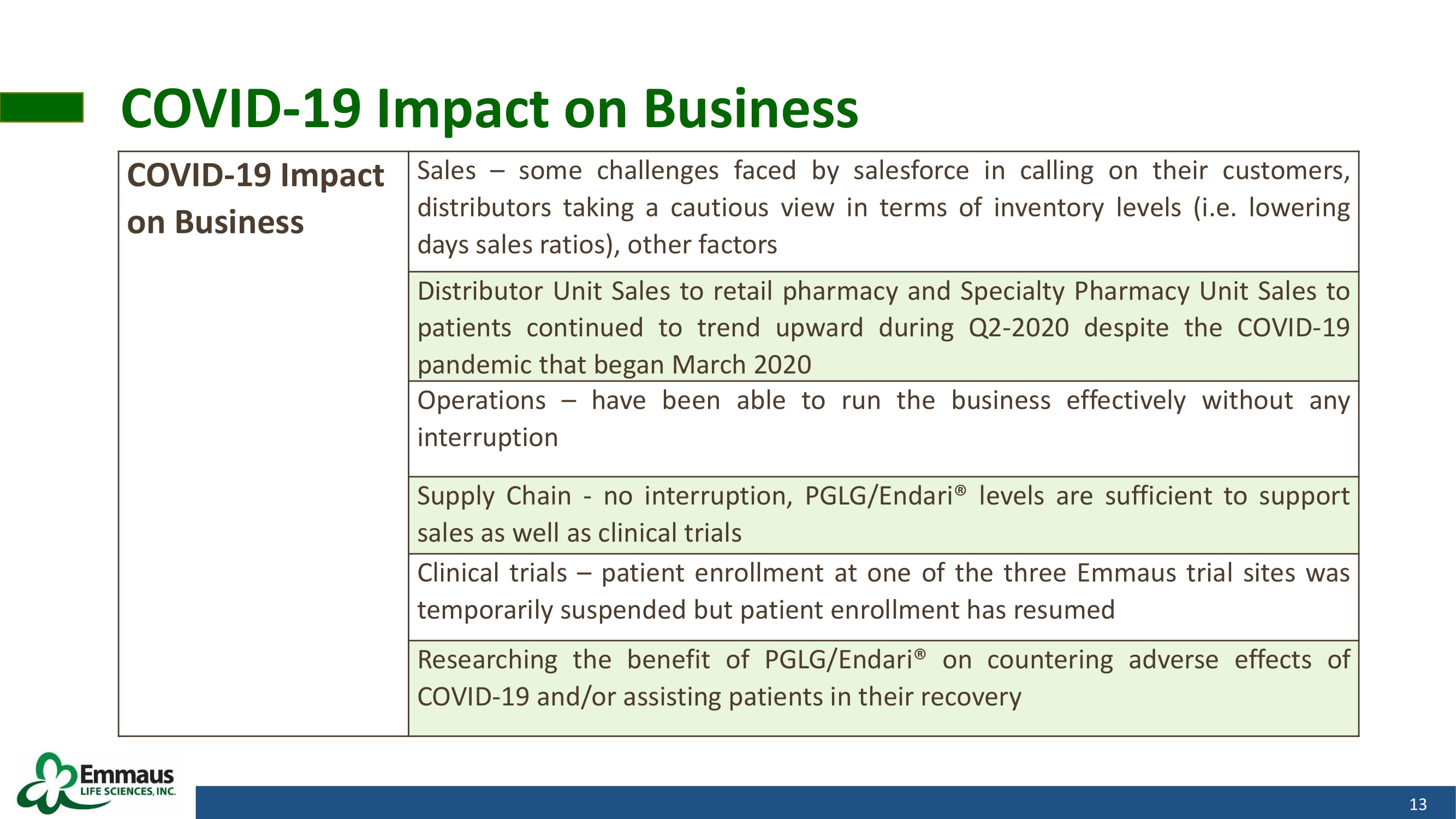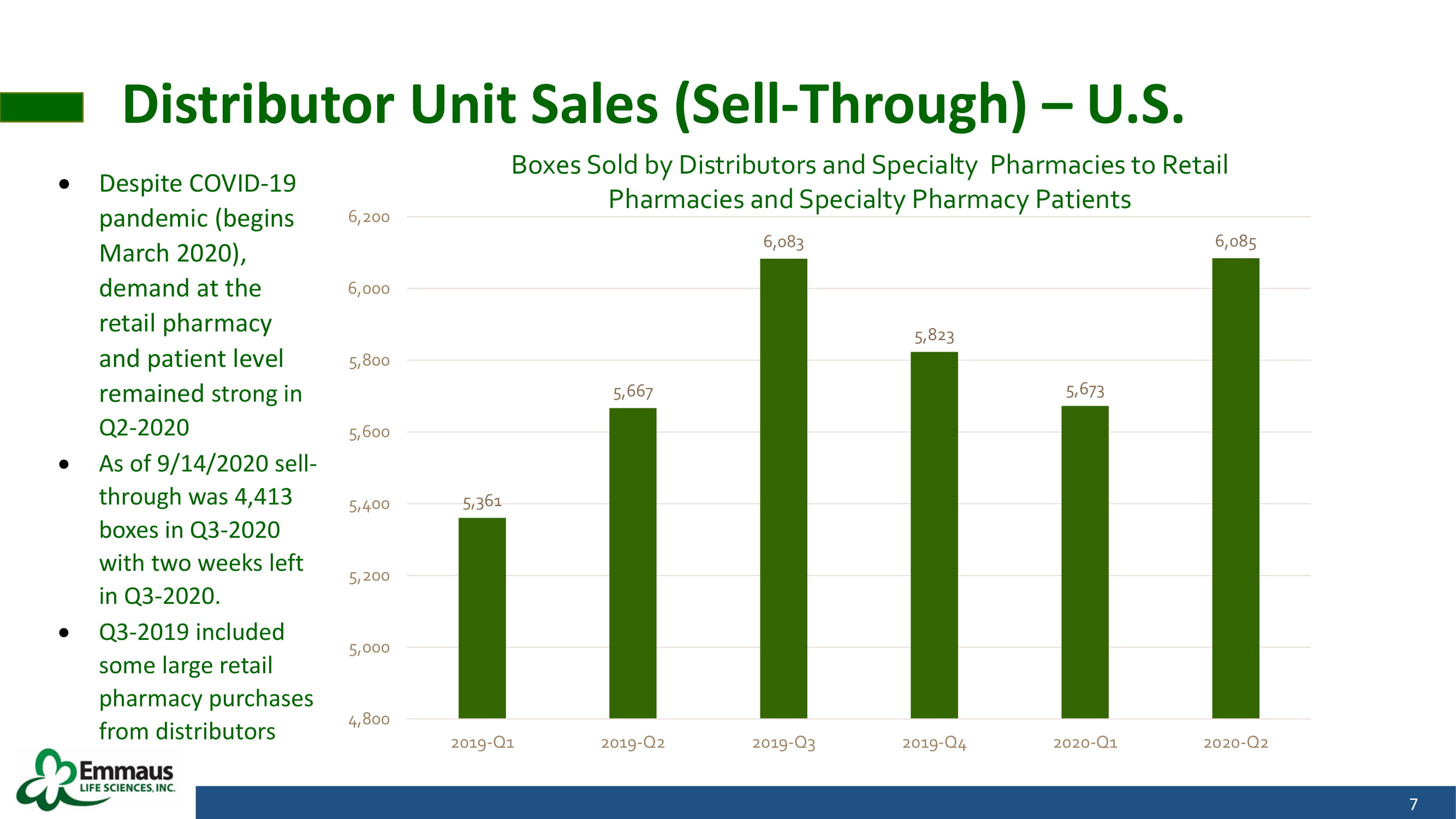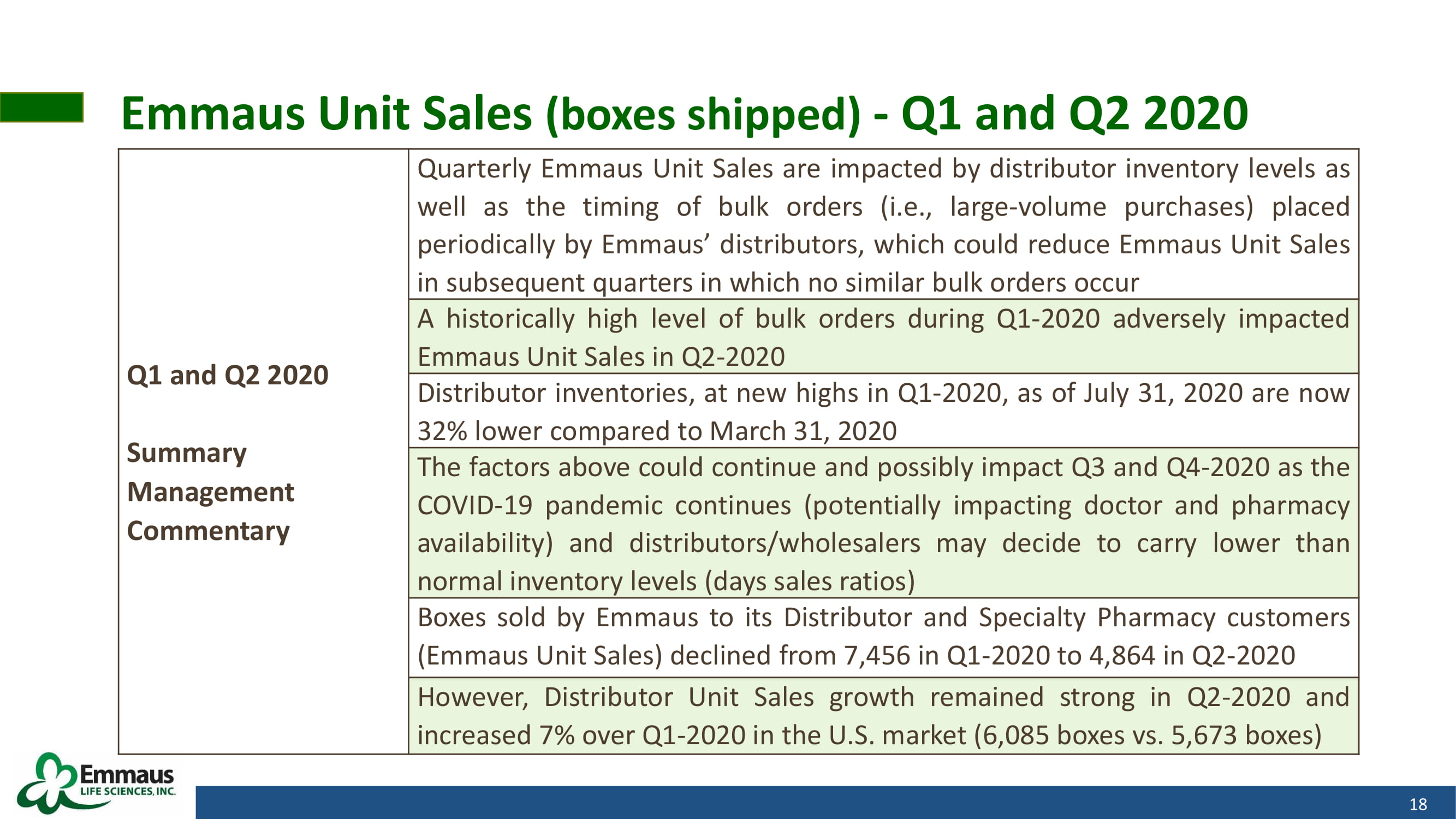 Emmaus Unit Sales (boxes shipped) - Q1 and Q2 2020 18 Q1 and Q2 2020 Summary Management Commentary Quarterly Emmaus Unit Sales are impacted by distributor inventory levels as well as the timing of bulk orders (i . e . , large - volume purchases) placed periodically by Emmaus’ distributors, which could reduce Emmaus Unit Sales in subsequent quarters in which no similar bulk orders occur A historically high level of bulk orders during Q 1 - 2020 adversely impacted Emmaus Unit Sales in Q 2 - 2020 Distributor inventories, at new highs in Q 1 - 2020 , as of July 31 , 2020 are now 32 % lower compared to March 31 , 2020 The factors above could continue and possibly impact Q 3 and Q 4 - 2020 as the COVID - 19 pandemic continues (potentially impacting doctor and pharmacy availability) and distributors/wholesalers may decide to carry lower than normal inventory levels (days sales ratios) Boxes sold by Emmaus to its Distributor and Specialty Pharmacy customers (Emmaus Unit Sales) declined from 7 , 456 in Q 1 - 2020 to 4 , 864 in Q 2 - 2020 However, Distributor Unit Sales growth remained strong in Q 2 - 2020 and increased 7 % over Q 1 - 2020 in the U . S . market ( 6 , 085 boxes vs . 5 , 673 boxes)