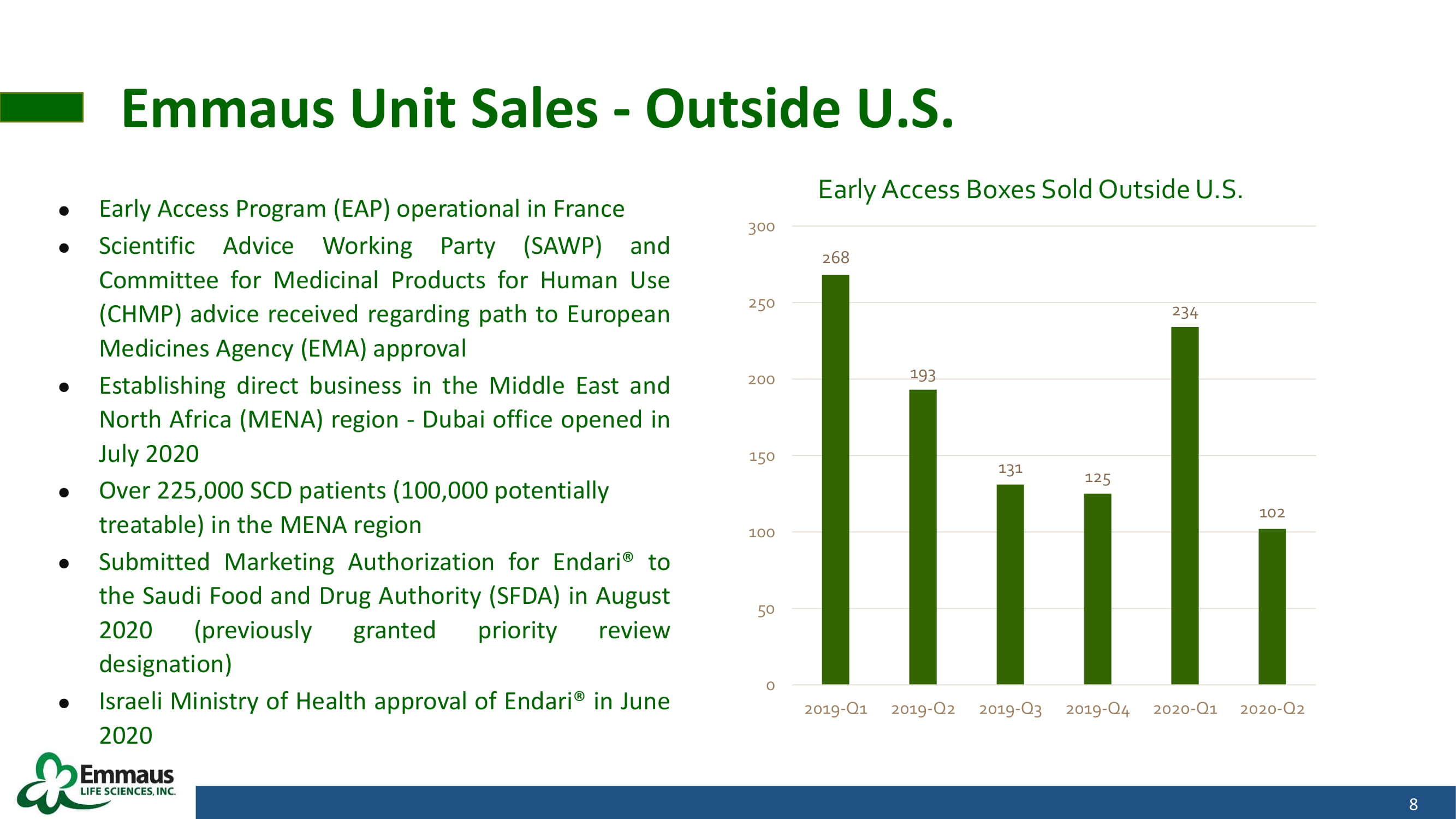 Distributor Unit Sales (Sell - Through) – U.S. 7 5,361 5,667 6,083 5,823 5,673 6,085 4,800 5,000 5,200 5,400 5,600 5,800 6,000 6,200 2019-Q1 2019-Q2 2019-Q3 2019-Q4 2020-Q1 2020-Q2 Boxes Sold by Distributors and Specialty Pharmacies to Retail Pharmacies and Specialty Pharmacy Patients Despite COVID - 19 pandemic (begins March 2020), demand at the retail pharmacy and patient level remained strong in Q2 - 2020 As of 9/14 /2020 sell - through was 4,413 boxes in Q3 - 2020 with two weeks left in Q3 - 2020. Q3 - 2019 included some large retail pharmacy purchases from distributors