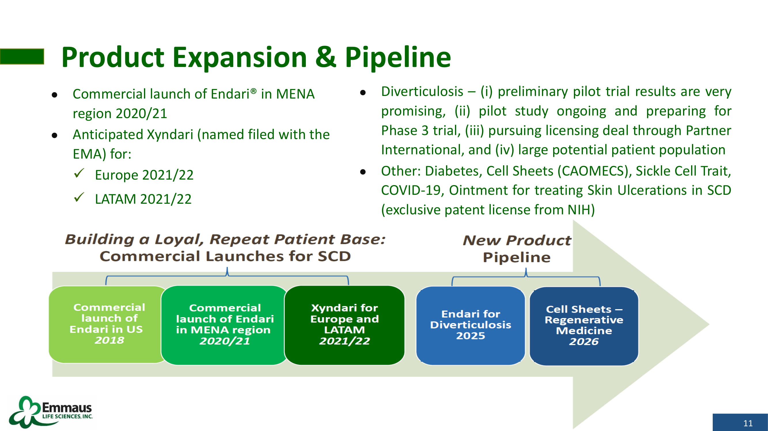 11 Diverticulosis – (i) preliminary pilot trial results are very promising, (ii) pilot study ongoing and preparing for Phase 3 trial, (iii) pursuing licensing deal through Partner International, and (iv) large potential patient population Other : Diabetes, Cell Sheets (CAOMECS), Sickle Cell Trait, COVID - 19 , Ointment for treating Skin Ulcerations in SCD (exclusive patent license from NIH) Product Expansion & Pipeline Commercial launch of Endari® in MENA region 2020/21 Anticipated Xyndari (named filed with the EMA) for: x Europe 2021/22 x LATAM 2021/22