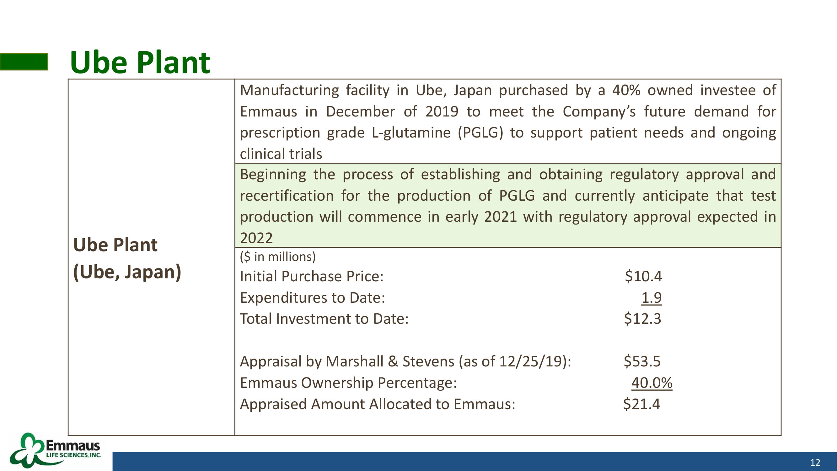 Ube Plant 12 Ube Plant (Ube, Japan) Manufacturing facility in Ube, Japan purchased by a 40 % owned investee of Emmaus in December of 2019 to meet the Company’s future demand for prescription grade L - glutamine (PGLG) to support patient needs and ongoing clinical trials Beginning the process of establishing and obtaining regulatory approval and recertification for the production of PGLG and currently anticipate that test production will commence in early 2021 with regulatory approval expected in 2022 ( $ in millions) Initial Purchase Price : $ 10 . 4 Expenditures to Date : 1 . 9 Total Investment to Date : $ 12 . 3 Appraisal by Marshall & Stevens (as of 12 / 25 / 19 ) : $ 53 . 5 Emmaus Ownership Percentage : 40 . 0 % Appraised Amount Allocated to Emmaus : $ 21 . 4