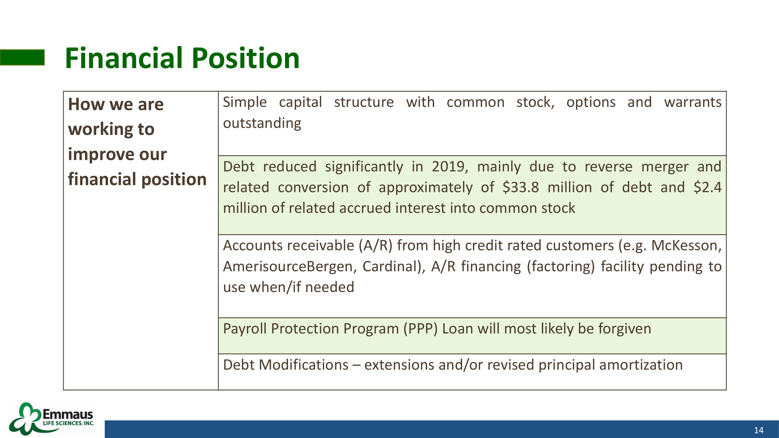 COVID - 19 Impact on Business 13 COVID - 19 Impact on Business Sales – some challenges faced by salesforce in calling on their customers, distributors taking a cautious view in terms of inventory levels (i . e . lowering days sales ratios), other factors Distributor Unit Sales to retail pharmacy and Specialty Pharmacy Unit Sales to patients continued to trend upward during Q 2 - 2020 despite the COVID - 19 pandemic that began March 2020 Operations – have been able to run the business effectively without any interruption Supply Chain - no interruption, PGLG/Endari® levels are sufficient to support sales as well as clinical trials Clinical trials – patient enrollment at one of the three Emmaus trial sites was temporarily suspended but patient enrollment has resumed Researching the benefit of PGLG/Endari® on countering adverse effects of COVID - 19 and/or assisting patients in their recovery
