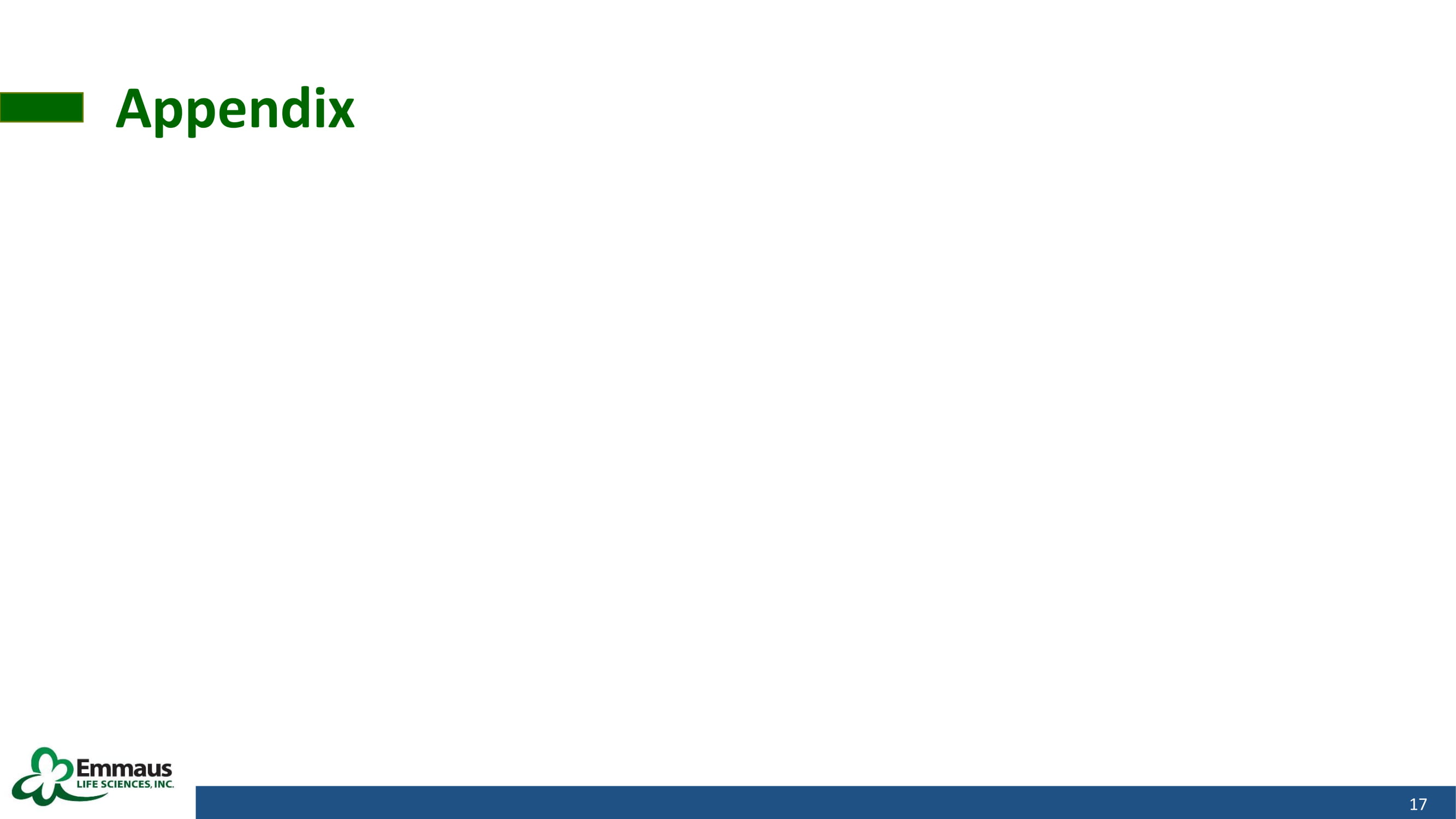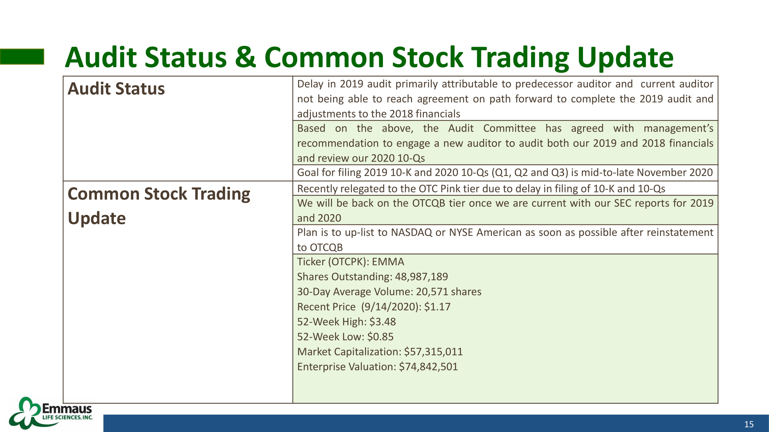 Audit Status & Common Stock Trading Update 15 Audit Status Delay in 2019 audit primarily attributable to predecessor auditor and current auditor not being able to reach agreement on path forward to complete the 2019 audit and adjustments to the 2018 financials Based on the above, the Audit Committee has agreed with management’s recommendation to engage a new auditor to audit both our 2019 and 2018 financials and review our 2020 10 - Qs Goal for filing 2019 10 - K and 2020 10 - Qs (Q 1 , Q 2 and Q 3 ) is mid - to - late November 2020 Common Stock Trading Update Recently relegated to the OTC Pink tier due to delay in filing of 10 - K and 10 - Qs We will be back on the OTCQB tier once we are current with our SEC reports for 2019 and 2020 Plan is to up - list to NASDAQ or NYSE American as soon as possible after reinstatement to OTCQB Ticker (OTCPK) : EMMA Shares Outstanding : 48 , 987 , 189 30 - Day Average Volume : 20 , 571 shares Recent Price ( 9 / 14 / 2020 ) : $ 1 . 17 52 - Week High : $ 3 . 48 52 - Week Low : $ 0 . 85 Market Capitalization : $ 57 , 315 , 011 Enterprise Valuation : $ 74 , 842 , 501