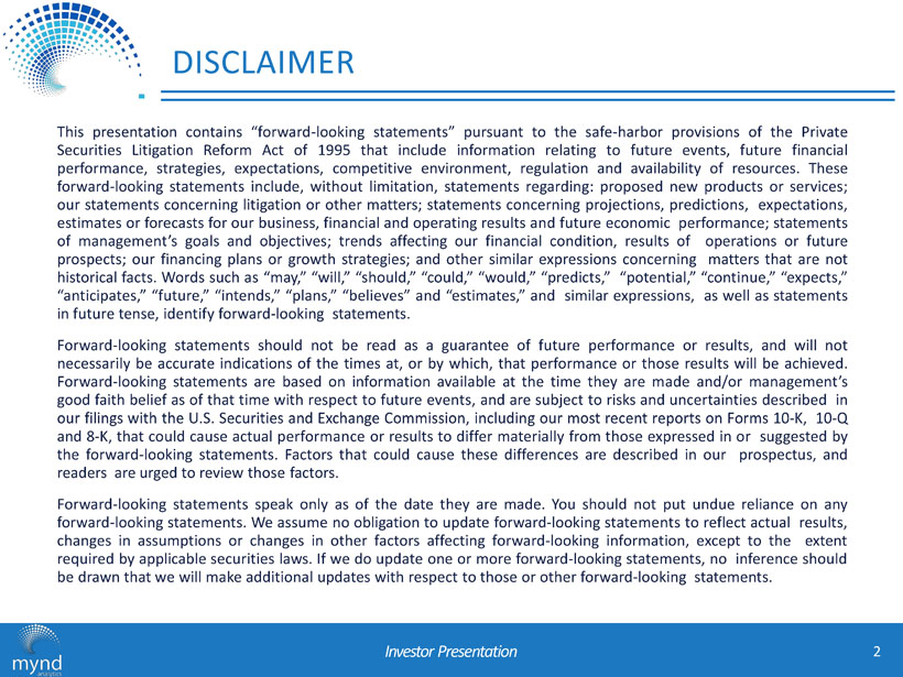 Robin L. Smith, MD, MBA, Chairman of the Board tel: 917 - 691 - 7409 email: robin@robinlsmith.com George C. Carpenter IV , President and Chief Executive Officer tel: 949 - 697 - 2161 email: gcarpenter@myndanalytics.com Don D’Ambrosio Chief Financial Officer tel: 949 - 420 - 4402 email: ddambrosio@myndanalytics.com CONTACT Investor Presentation 25