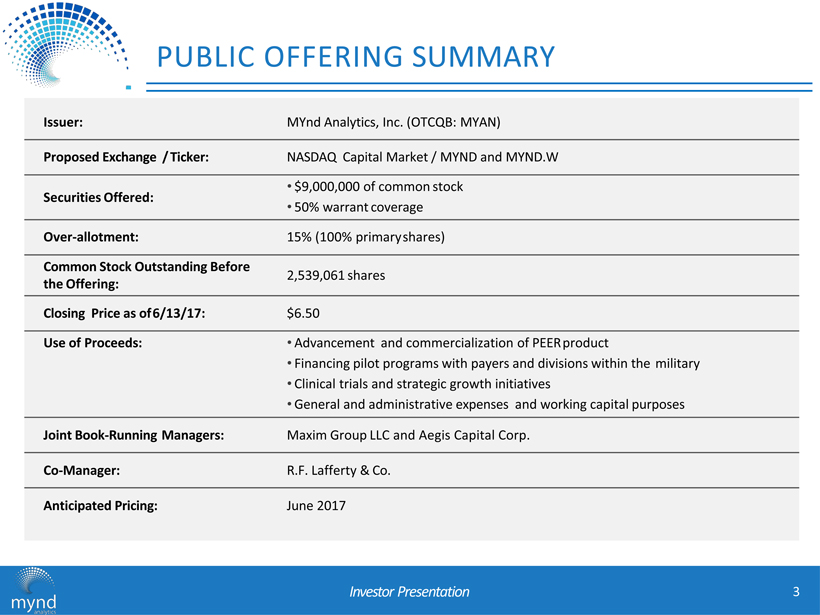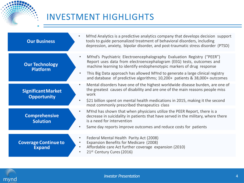 Issuer: MYnd Analytics, Inc. (OTCQB: MYAN) Proposed Exchange / Ticker: NASDAQ Capital Market / MYND and MYND.W Securities Offered: • $9,000,000 of common stock • 50% warrant coverage Over - allotment: 15% (100% primary shares) Common Stock Outstanding Before the Offering: 2,539,061 shares Closing Price as of 6/13/17: $6.50 Use of Proceeds: • Advancement and commercialization of PEER product • Financing pilot programs with payers and divisions within the military • Clinical trials and strategic growth initiatives • General and administrative expenses and working capital purposes Joint Book - Running Managers: Maxim Group LLC and Aegis Capital Corp. Co - Manager: R.F. Lafferty & Co. Anticipated Pricing: June 2017 Investor Presentation 3 PUBLIC OFFERING SUMMARY