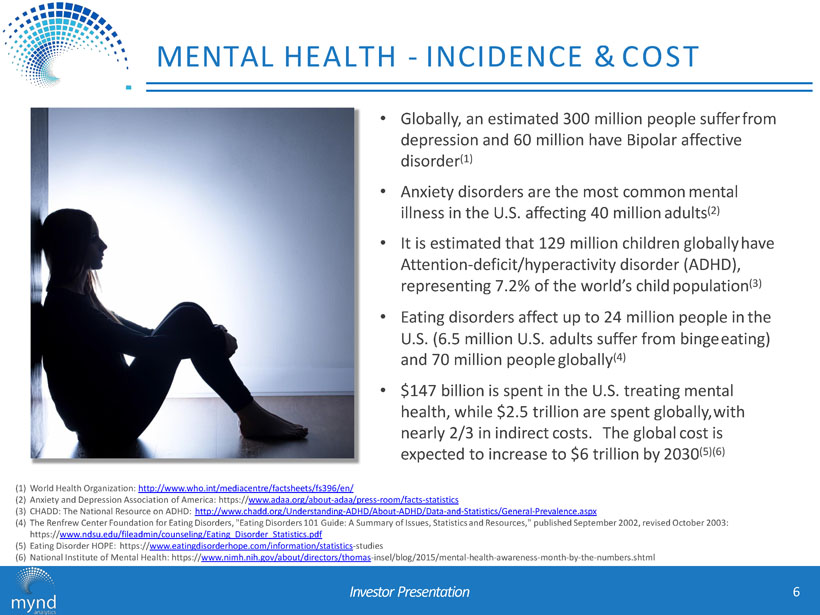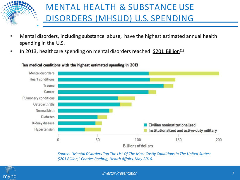 • Globally, an estimated 300 million people suffer from depression and 60 million have Bipolar affective disorder (1) • Anxiety disorders are the most common mental illness in the U.S. affecting 40 million adults (2) • It is estimated that 129 million children globally have Attention - deficit/hyperactivity disorder (ADHD), representing 7.2% of the world’s child population (3) • Eating disorders affect up to 24 million people in the U.S. (6.5 million U.S. adults suffer from binge eating) and 70 million people globally (4) • $147 billion is spent in the U.S. treating mental health, while $2.5 trillion are spent globally, with nearly 2/3 in indirect costs. The global cost is expected to increase to $6 trillion by 2030 (5)(6) MENTAL HEALTH - INCIDENCE & COST (1) World Health Organization: http://www.who.int/mediacentre/factsheets/fs396/en/ (2) Anxiety and Depression Association of America: https:// www.adaa.org/about - adaa/press - room/facts - statistics (3) CHADD: The National Resource on ADHD: http://www.chadd.org/Understanding - ADHD/About - ADHD/Data - and - Statistics/General - Prevalence.aspx (4) The Renfrew Center Foundation for Eating Disorders, "Eating Disorders 101 Guide: A Summary of Issues, Statistics and Resources," published September 2002, revised October 2003: https:// www.ndsu.edu/fileadmin/counseling/Eating_Disorder_Statistics.pdf (5) Eating Disorder HOPE: https:// www.eatingdisorderhope.com/information/statistics - studies (6) National Institute of Mental Health: https:// www.nimh.nih.gov/about/directors/thomas - insel/blog/2015/mental - health - awareness - month - by - the - numbers.shtml Investor Presentation 6