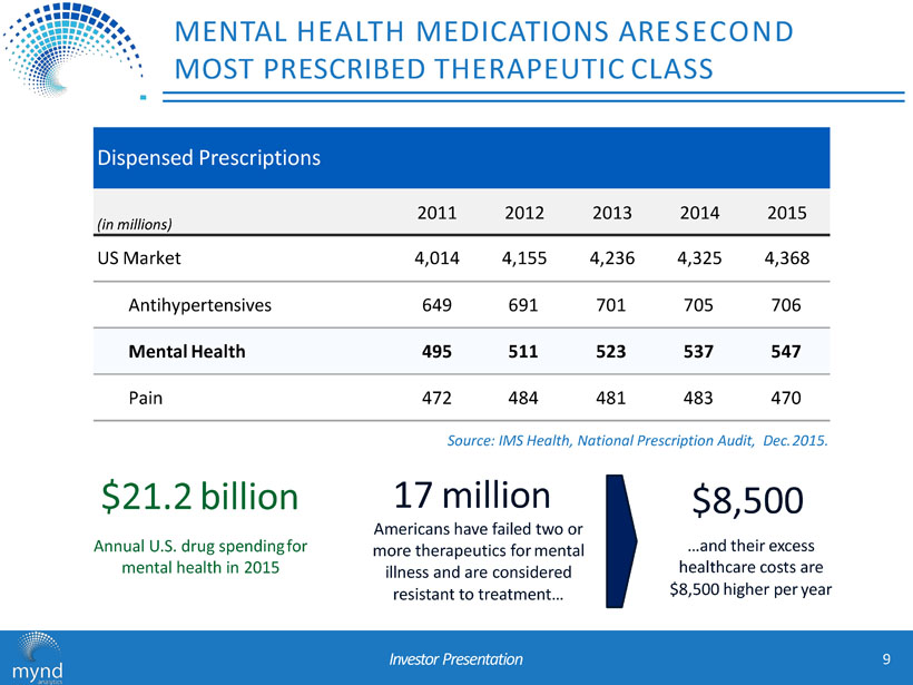 Source: Melek S., Norris D., Paulus J.: Economic Impact of Integrated Medical - Behavioral Healthcare: Implications for Psychiatry. Prepared for APA; 2014, pp.1 - 39. Investor Presentation 8 Population % with Behavioral Health (BH) Diagnosis Per - member per - month (PMPM) cost without BH Diagnosis PMPM with BH Diagnosis Increase in Total PMPM with BH Diagnosis Commercial 15% $340 $941 276% Medicare 9% $582 $1429 245% Medicaid 20% $381 $1301 341% All Insurers 14% $397 $1085 273% IMPACT OF MHSUD ON COMMON HIGH COST MEDICAL CONDITIONS IN 2012