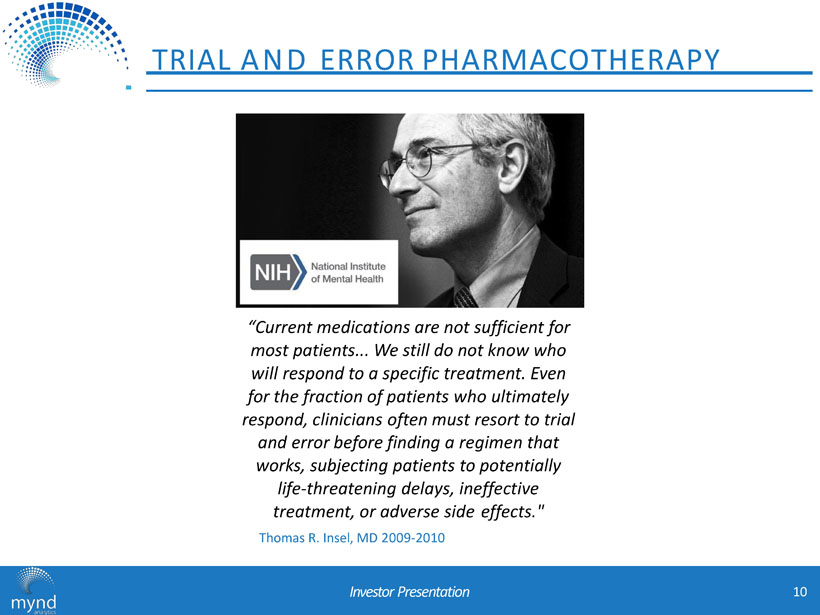 TRIAL AND ERROR PHARMACOTHERAPY Investor Presentation 10 “Current medications are not sufficient for most patients... We still do not know who will respond to a specific treatment. Even for the fraction of patients who ultimately respond, clinicians often must resort to trial and error before finding a regimen that works, subjecting patients to potentially life - threatening delays, ineffective treatment, or adverse side effects." Thomas R. Insel, MD 2009 - 2010