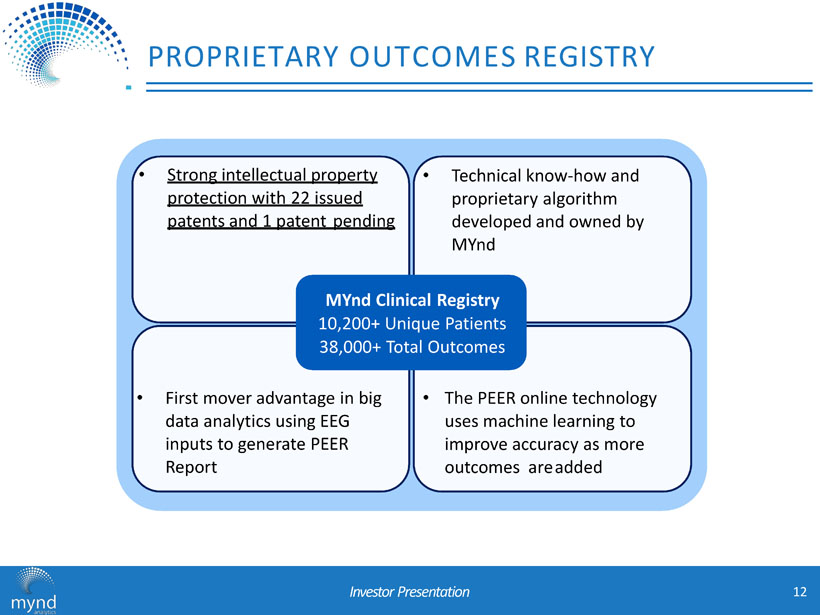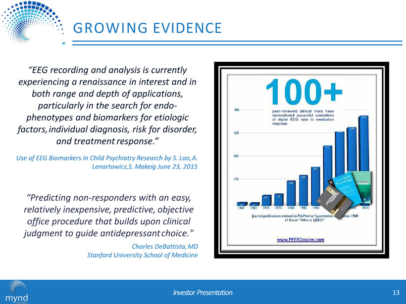 PROPRIETARY OUTCOMES REGISTRY Investor Presentation 12 MYnd Clinical Registry 10,200+ Unique Patients 38,000+ Total Outcomes • Strong intellectual property protection with 22 issued patents and 1 patent pending • Technical know - how and proprietary algorithm developed and owned by MYnd • First mover advantage in big data analytics using EEG inputs to generate PEER Report • The PEER online technology uses machine learning to improve accuracy as more outcomes are added