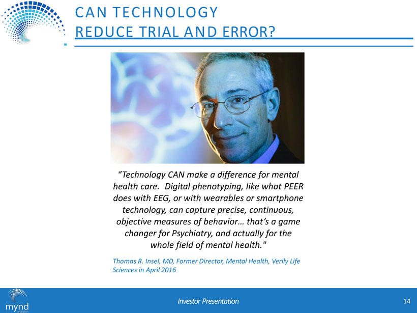 “ EEG recording and analysis is currently experiencing a renaissance in interest and in both range and depth of applications, particularly in the search for endo - phenotypes and biomarkers for etiologic factors, individual diagnosis, risk for disorder, and treatment response.” Use of EEG Biomarkers in Child Psychiatry Research by S. Loo, A. Lenartowicz,S. Makeig June 23, 2015 “Predicting non - responders with an easy, relatively inexpensive, predictive, objective office procedure that builds upon clinical judgment to guide antidepressant choice." Charles DeBattista, MD Stanford University School of Medicine Investor Presentation 13 GROWING EVIDENCE