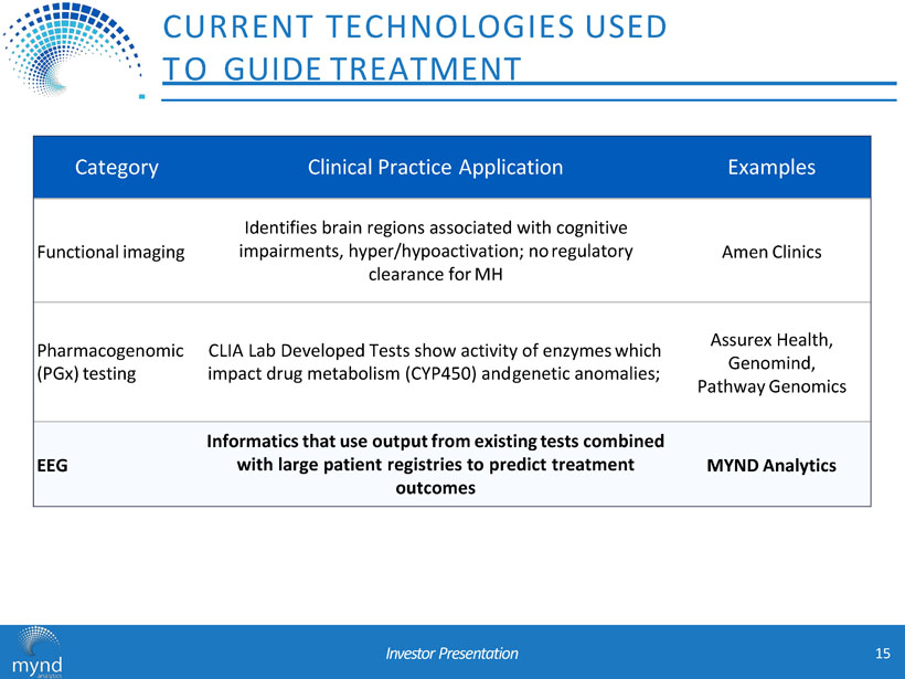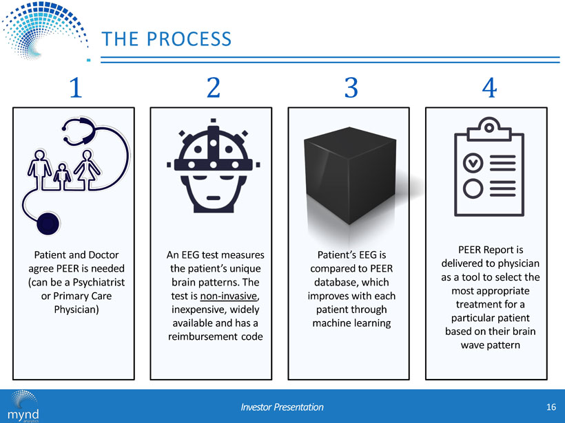 Category Clinical Practice Application Examples Functional imaging Identifies brain regions associated with cognitive impairments, hyper/hypoactivation; no regulatory clearance for MH Amen Clinics Pharmacogenomic (PGx) testing CLIA Lab Developed Tests show activity of enzymes which impact drug metabolism (CYP450) and genetic anomalies; Assurex Health, Genomind, Pathway Genomics EEG Informatics that use output from existing tests combined with large patient registries to predict treatment outcomes MYND Analytics Investor Presentation 15 CURRENT TECHNOLOGIES USED TO GUIDE TREATMENT