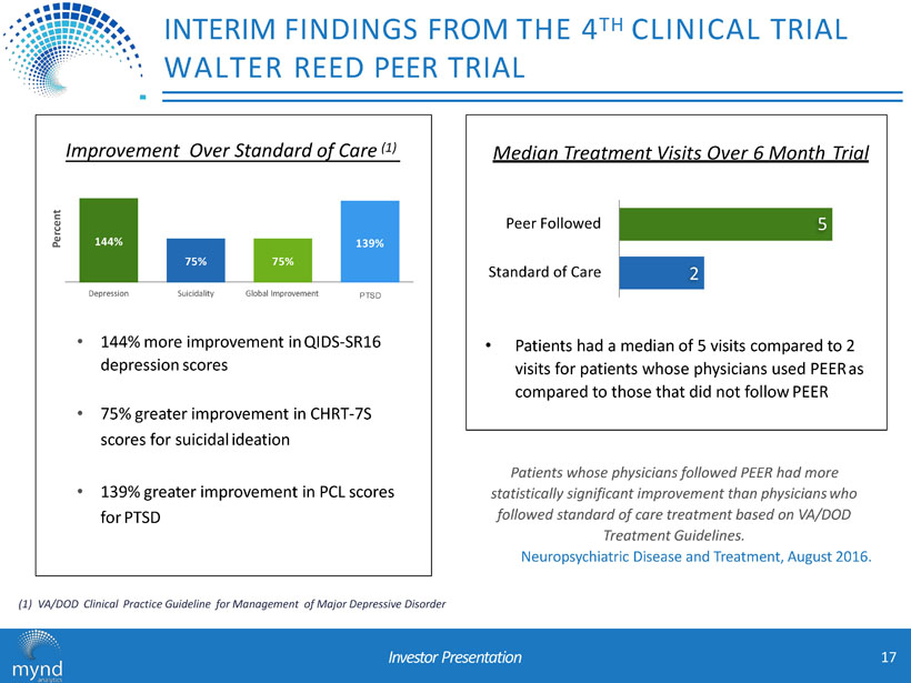 • Patients had a median of 5 visits compared to 2 visits for patients whose physicians used PEER as compared to those that did not follow PEER 144% 75% 75% 139% Depression Suicidality Global Improvement P T S P e r c e n t (1) VA/DOD Clinical Practice Guideline for Management of Major Depressive Disorder 5 2 Peer Followed Standard of Care Improvement Over Standard of Care (1) Median Treatment Visits Over 6 Month Trial INTERIM FINDINGS FROM THE 4 TH CLINICAL TRIAL WALTER REED PEER TRIAL P T S D Investor Presentation 17 • 144% more improvement in QIDS - SR16 depression scores • 75% greater improvement in CHRT - 7S scores for suicidal ideation • 139% greater improvement in PCL scores for PTSD Patients whose physicians followed PEER had more statistically significant improvement than physicians who followed standard of care treatment based on VA/DOD Treatment Guidelines. Neuropsychiatric Disease and Treatment, August 2016.