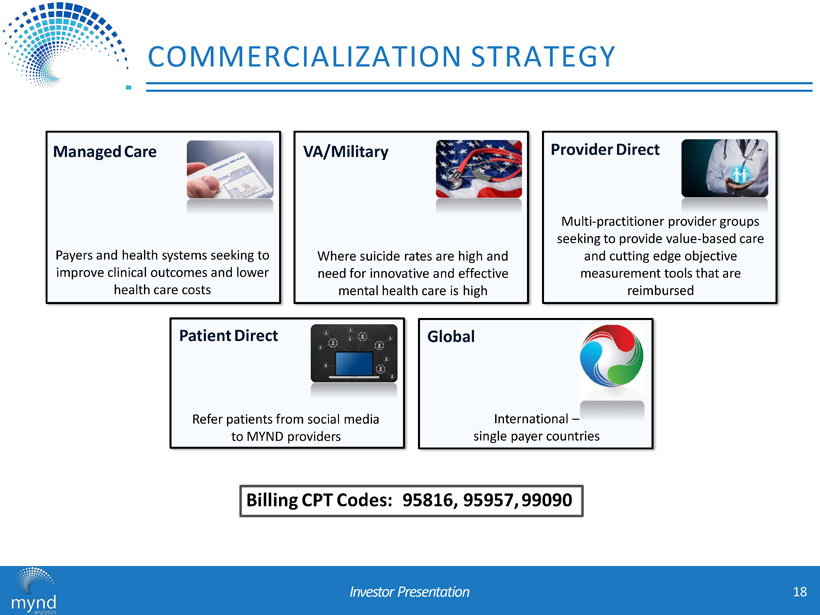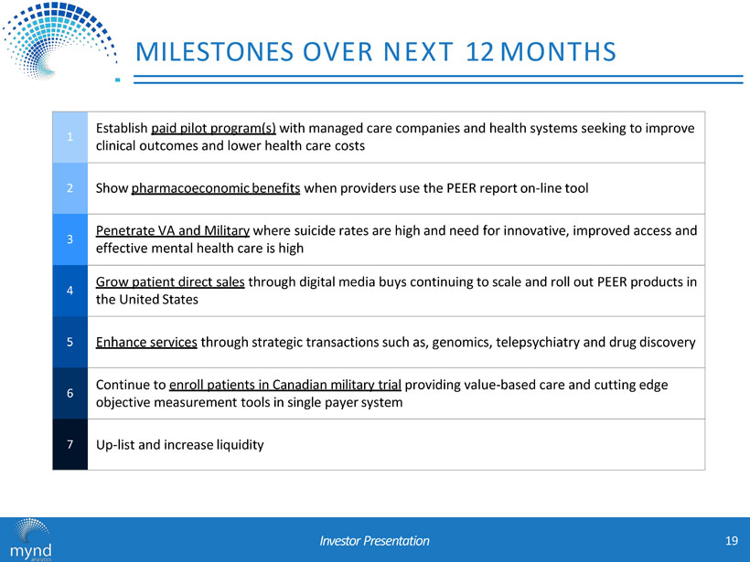COMMERCIALIZATION STRATEGY Managed Care Payers and health systems seeking to improve clinical outcomes and lower health care costs VA/Military Where suicide rates are high and need for innovative and effective mental health care is high Provider Direct Multi - practitioner provider groups seeking to provide value - based care and cutting edge objective measurement tools that are reimbursed Patient Direct Refer patients from social media to MYND providers Global International – single payer countries Billing CPT Codes: 95816, 95957, 99090 Investor Presentation 18