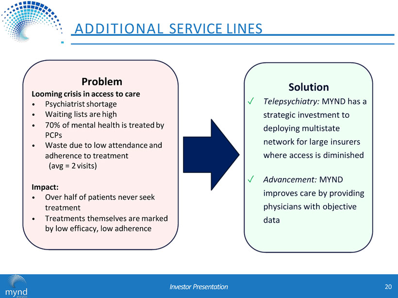 ADDITIONAL SERVICE LINES Problem Looming crisis in access to care • Psychiatrist shortage • Waiting lists are high • 70% of mental health is treated by PCPs • Waste due to low attendance and adherence to treatment (avg = 2 visits) Impact: • Over half of patients never seek treatment • Treatments themselves are marked by low efficacy, low adherence Solution ✓ Telepsychiatry: MYND has a strategic investment to deploying multistate network for large insurers where access is diminished ✓ Advancement: MYND improves care by providing physicians with objective data Investor Presentation 20