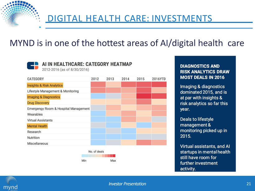 MYND is in one of the hottest areas of AI/digital health care DIGITAL HEALTH CARE: INVESTMENTS Investor Presentation 21