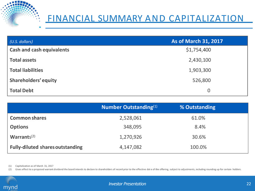 Common shares 2,528,0 6 1 61 . 0 % Options 348 , 09 5 8 . 4 % Warrant s (2) 1,270,9 2 6 30 . 6 % Fully - diluted shares outstanding 4 , 147 , 0 8 2 100 . 0 % Investor Presentation 22 (U.S. dollars) As of March 31, 2017 Cash and cash equivalents $1 , 754 , 40 0 Total assets 2,430, 1 0 0 Total liabilities 1,903, 3 0 0 Shareholders’ equity 526 , 80 0 Total Debt 0 Number Outstanding (1) % Outstanding FINANCIAL SUMMARY AND CAPITALIZATION (1) Capitalization as of March 31, 2017 (2) Gives effect to a proposed warrant dividend the board intends to declare to shareholders of record prior to the effective dat e of the offering, subject to adjustments, including rounding up for certain holders.