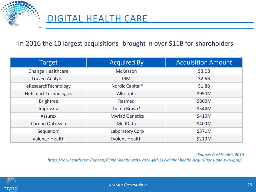Source: RockHealth, 2016 https://rockhealth.com/reports/digital - health - exits - 2016 - ytd - 112 - digital - health - acquisitions - and - two - ipos/. Investor Presentation 23 Target Acquired By Acquisition Amount Change Healthcare McKesson $3.0B Truven Analytics IBM $2.6B eResearchTechnology Nordic Capital* $1.8B Netsmart Technologies Allscripts $950M Brightree Resmed $800M Imprivata Thoma Bravo* $544M Assurex Myriad Genetics $410M Cardon Outreach MedData $400M Sequenom Laboratory Corp $371M Valence Health Evolent Health $219M In 2016 t he 10 largest acquisitions brought in over $11B for shareholders DIGITAL HEALTH CARE