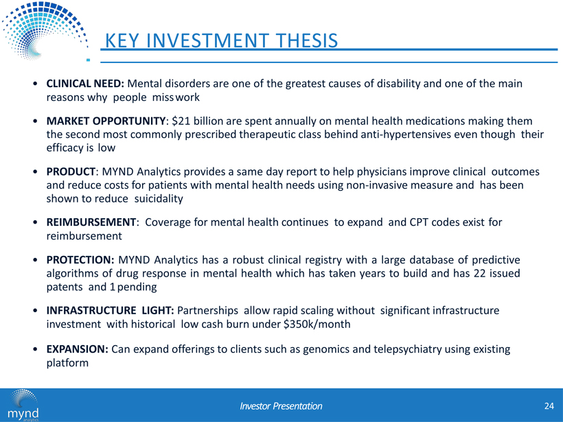 • CLINICAL NEED: Mental disorders are one of the greatest causes of disability and one of the main reasons why people miss work • MARKET OPPORTUNITY : $21 billion are spent annually on mental health medications making them the second most commonly prescribed therapeutic class behind anti - hypertensives even though their efficacy is low • PRODUCT : MYND Analytics provides a same day report to help physicians improve clinical outcomes and reduce costs for patients with mental health needs using non - invasive measure and has been shown to reduce suicidality • REIMBURSEMENT : Coverage for mental health continues to expand and CPT codes exist for reimbursement • PROTECTION : MYND Analytics has a robust clinical registry with a large database of predictive algorithms of drug response in mental health which has taken years to build and has 22 issued patents and 1 pending • INFRASTRUCTURE LIGHT: Partnerships allow rapid scaling without significant infrastructure investment with historical low cash burn under $350k/month • EXPANSION: Can expand offerings to clients such as genomics and telepsychiatry using existing platform Investor Presentation 24 KEY INVESTMENT THESIS