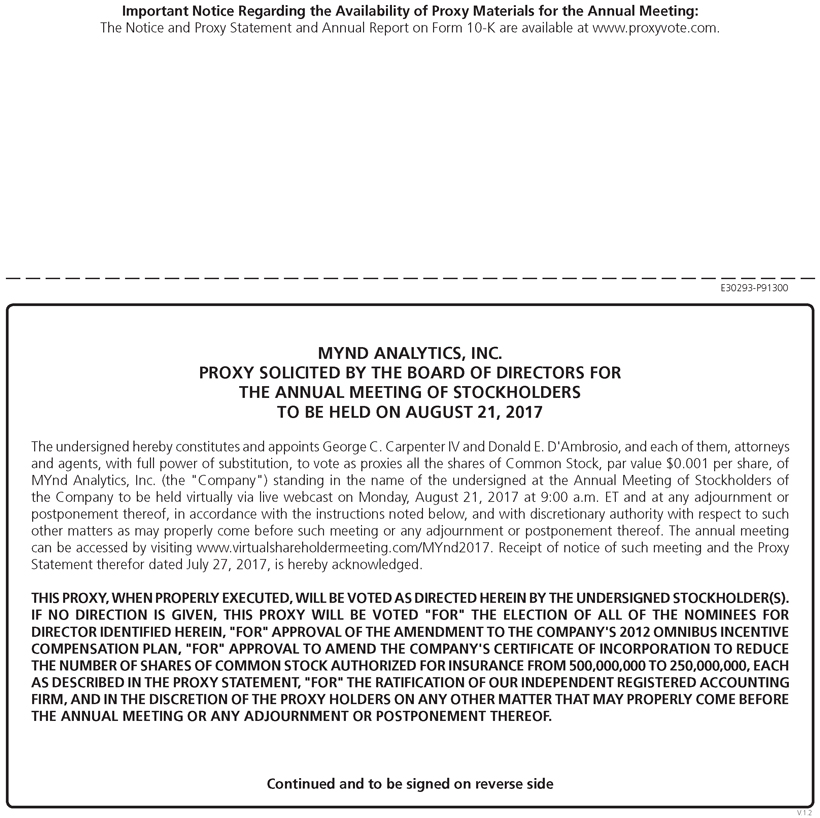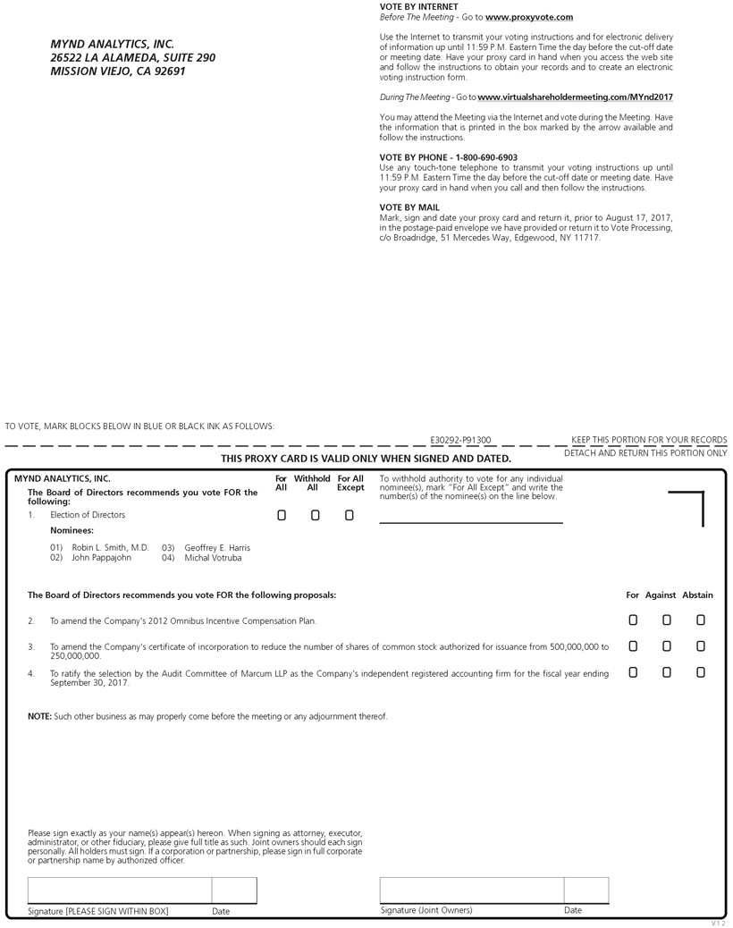 Important Notice Regarding Internet Availability of Proxy Materials For The Annual Meeting Of Stockholders To Be Held on August 21, 2017 at 9:00 a.m. ET: This proxy statement, the accompanying form of proxy card and MYnd's Annual Report on Form 10-K for the fiscal year ended September 30, 2016 are available at www.myndanalytics.com. We are providing you access to our proxy materials both by sending you this full set of proxy materials and by notifying you of the availability of our proxy materials on the Internet.